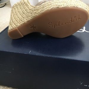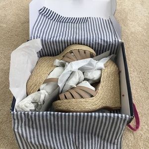 Raffia wrapped 4” heel on 1 1/2” platform. Cushioned insole, rubberized sole. All leather strappy front with buckled T strap. NIB. Never worn. Size 8, true to size.