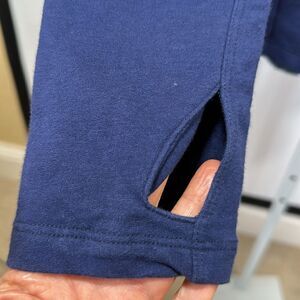 Open front. Draped lapel. Long sleeves with thumb holes. Center back ruching with drawstring. Side slant pockets. Navy blue. Super soft material. Stretch material. Yoga. Pilates. Activewear. Athleisure. Ballet. D