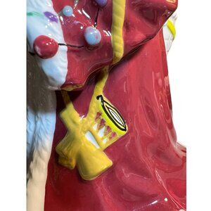 This beautifully handpainted collectible Spode cookie jar, titled "Christmas Tree", is perfect for adding festive cheer to your home! Santa wears his classic red robe and hat trimmed with white fur, embodying the spirit of Christmas. In one arm, he carries a teddy bear, a string of colorful lights, and a drum, while the other arm holds a festive wreath and a large pink gift topped with a yellow bow. On his back, Santa carries a wicker basket filled with a decorated Christmas tree, complete with ornaments and lights. Instead of a star or angel, a miniature Santa sit on the top of the tree.