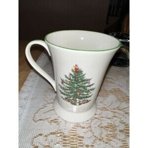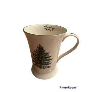 Spode green trim Christmas Tree 12 Oz Porcelain Cofee Mug Cup 4¾in high Holiday. Spode Christmas Tree pattern china coffee cup / mug gloss glazed green trimmed Christmas tree design mugs are 4 3/4 inches tall, 3 3/4 inches diameter at the rim. Very good condition no cracks, no chips, no stains.Spode Christmas Tree c.1938 S3324-A10 dishwasher & microwave safe marks on the bottom