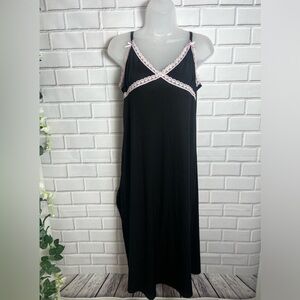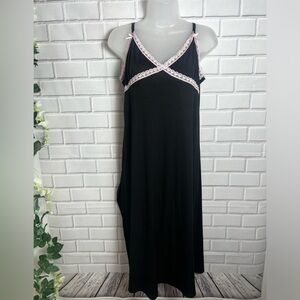 Elegant ribbed cami black sleep stretch dress with delicate pink lace trim. Open hem sides