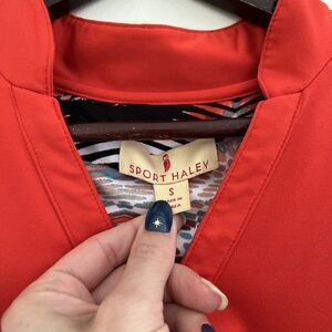 This buttonless polo from Sport Haley is in excellent condition without any flaws. Features a rhinestone detailing your neck, and a gorgeous abstract Australiana style print on roll sleeves and where the name tag label is. Gorgeous blood orange color.