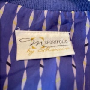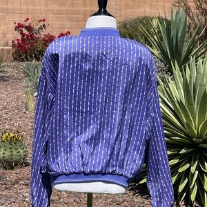 ZIPPERED FRONT, FULLY LINED, ADJUSTABLE SHOULDER PADS, PURPLE/WHITE DESIGN ON FABRIC, LONG SLEEVES, NECK AND SLEEVES CUFFED WITH PURPLE STRETCHABLE FABRIC, SIZE S/M