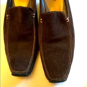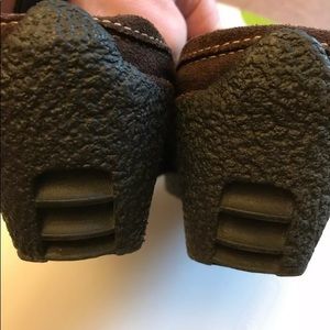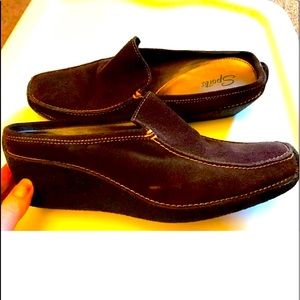 Gorgeous pair of SPORTO women's ladies dark brown suede slip on mules / driving moccasins with 3" wedge rubber crepe heels