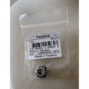 This is an authentic PANDORA charm featuring a heart-shaped design with a two-tone silver and 14K gold combination. The charm is adorned with pavé-set gold stones and is made of sterling silver. The charm represents the theme of love and hearts, perfect for spreading love. Made in Thailand, this charm is a stylish addition to any charm bracelet.