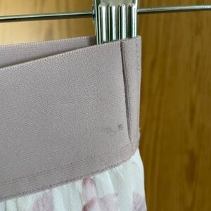 White and pale pink floral Sakura design skirt with an elastic comfort waist and a fit and flare twirly design. One tiny stain on waistband that is completely invisible when the skirt is on (reflected in price).