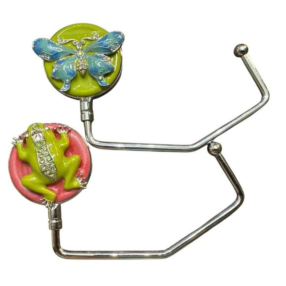 SPRING STREET PURSE HOOKS SET OF 2 FROG & BLUE FLOWER HANDBAG HANGERS