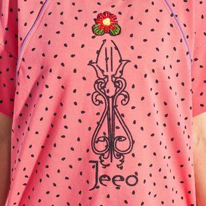 In the front you will see black polkadot, seeds like print, violet pipings which reflect at night, crystal emballishment, black Jeeo coat of arms print and contrasting green lace at the finishing trim.