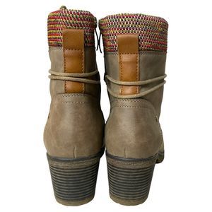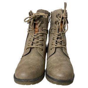 Spring Step Style: Hellewn Stylish, water resistant, casual mid boot featuring a soft padded woven cuff, functional lace-up design for maximum adjustability and a decorative outside zipper. Heel Height (approximately): 2 1/4" Platform Height (approximately): 3/4" Shaft Height (approximately): 5 1/4" Circumference (approximately): 12"-13" Features: -Round toe, vegan friendly synthetic upper, round cotton laces, and antiqued metal eyelets and hardware. -Inside zipper closure