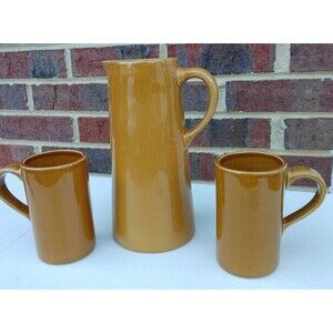 This set includes a beautiful Pottery Barn pitcher and two matching mugs. The glossy brown ceramic material and colonial style make it perfect for any occasion. The set is microwave and dishwasher safe for easy use and maintenance. It is a 3 piece set, consisting of one pitcher and two mugs, and was made in China. The color and finish are perfect for any home decor and can be used for both everyday use or special occasions. Add this set to your collection today!