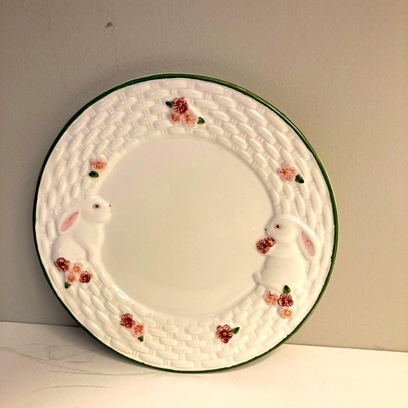 A delightful celebration of springtime, beautifully designed with two charming Bunnies and floral accents. It has a green trim. New, never used.