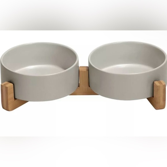One bowl for food and one for water, Each ceramic bowl has a Unique bamboo stand, raising the dishes closer to your pet for more comfortable eating.