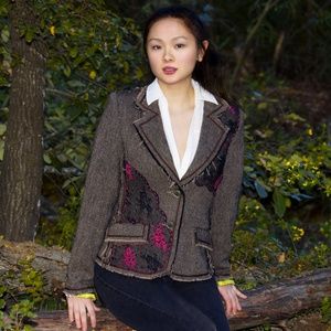 This is a really nice 60% wool/poly/sik blend blazer. The inside is lined with green silk. beautiful black lace with pink floral accents adorn the back of this sharp jacket and its in excellent condition. Made in France. Measurements Sleeve is 23" Length is 22"pit to pit closed is 18" Reasonable offers welcome.Smoke free home. Size Medium. One of a kind.!