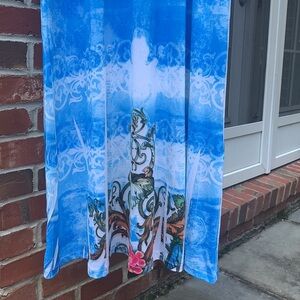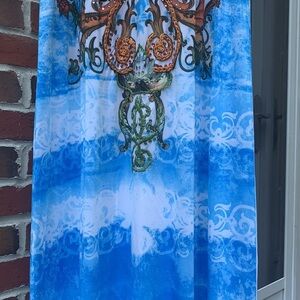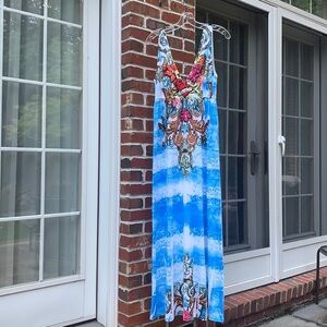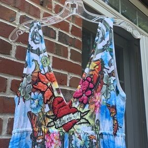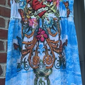 Gorgeous dress with lots of bright colors and embellishments with rhinestones - see close up pics. V-Neck Cut. Super lightweight and airy dress. Great for summer and vacations. Size medium. Length Measurement shown in pictures.