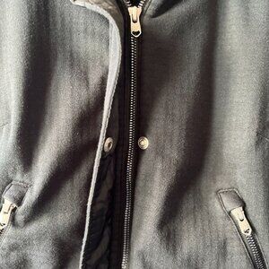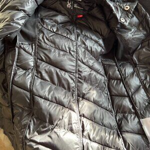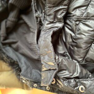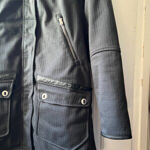 SYDER Jacket in a Parka style, worn only a couple of times, Black, Size S, the high-quality polyester fabric with its brushed inside is very soft and has some stretch, removable lining is soft and down-like and buttons in for colder weather, hood with removable fur accent, vegan leather accents on shoulders and pockets, two-way zip closure and snaps at placket, two slanted front pocket with Zip, two front patch pockets with metal buttons, length from shoulder to hem approx 32 inches, shoulder to shoulder across approx. 16 inches. 100% polyester fibers.