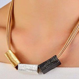 SQUARE CONSTRUCTION TUBES TRI TONE ON FAUX LEATHER CORDS NECKLACE 46