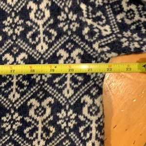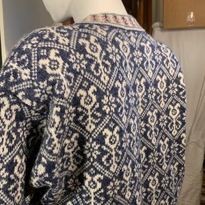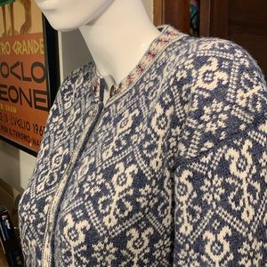 SQUAW VALLEY NORDIC WOOL ALPINE WINTER SKI CARDIGAN SWEATER THICK KNIT. Gorgeous Allover Nordic abstract pattern in blue and cream makes this cardigan a standout. All buttons are silvertone with Alpine flower motifs. Trim on placket, collar and cuffs. Size tag is S, but please see measurements for your best fit.