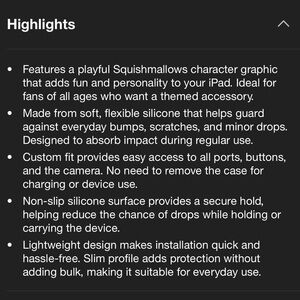 Help protect your iPad 10.2 inch with this Squishmallows-themed silicone case. Designed to help absorb impact from everyday use, the flexible silicone construction offers a comfortable grip and helps guard against minor bumps and scratches. Lightweight and easy to install, this case includes precise cutouts for full access to the camera, buttons, and ports. The fun character-inspired design adds a touch of personality to your device. Suitable for use at home, school, or on the go.