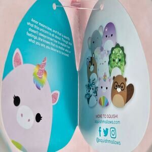 Meet Amor the Unicorn, a lovable Squishmallows plush from the Pride Squad collection. This soft, marshmallow-like toy features a light pink body, glittery horn, rainbow belly, and shiny pink ears. With embroidered eyes and a colorful mane, Amor brings comfort and charm to any collection. Released in 2021 by Kellytoy, this 8" plush is perfect for cuddling, gifting, or displaying. Whether you're a collector or just love unicorns, Amor is a heartwarming addition to your squad.