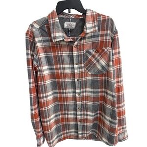 SRK Orange Grey White Plaid Long Sleeve Button Up Warm Flannel Shirt Mens XL, first picture is AI generated. The rest are the actual item.