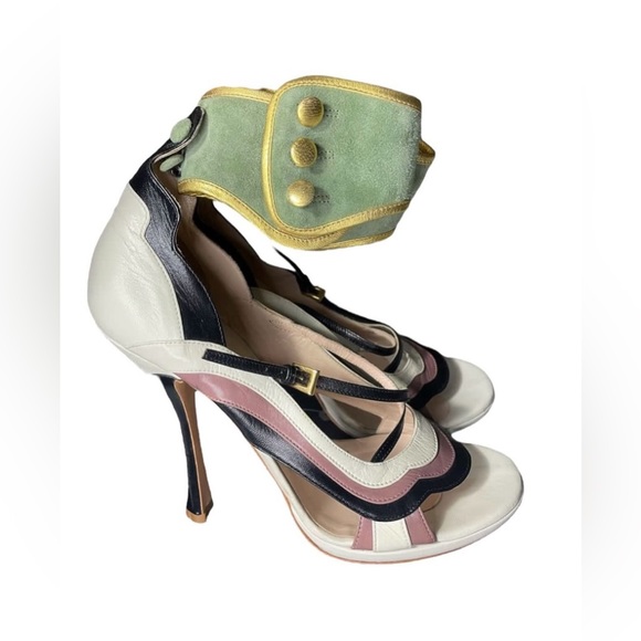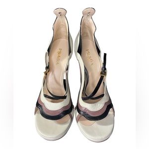 Very sexy ss08 Prada fairy heels aka wave heels! Very beautiful and unique designer with the removable ankle cuff! And the buttons on the side make these heels identifiable 🧚 comes with original box and dust bag. Size euro 39 which is equivalent to an 8-9 in US, maybe better for narrower foot too. Please see images, the heel is in great condition, the only flaws are the pen marks on the prada logo (not visible when wearing obviously). Please know that I have an online vintage designer store, and prices are better on there since I can avoid fees! :)