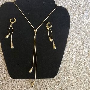 This elegant tear drop stainless steel Duabi gold jewelry set features a stunning necklace and matching earrings. Perfect for adding a touch of sophistication to any outfit.