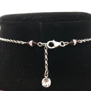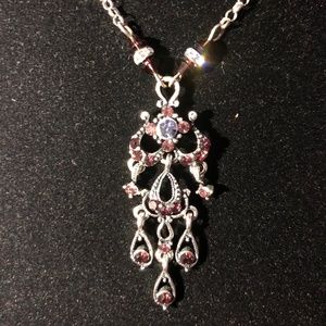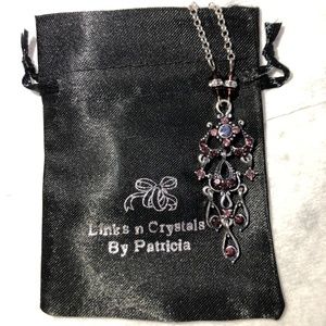 Sterling Silver with genuine Swarovski crystals in garnet red and iridescent genuine Swarovski crystal and Sterling Silver spacers; light pink Genuine Swarovski accent crystals; Lariat choker adorned with beautiful Stainless Steel Owl chandelier pendant featuring purple, pink and iridescent genuine Swarovski crystals. Lobster claw clasp. Extender with white genuine Swarovski crystal. Hand-linked, hand crafter. One-of-a-kind.