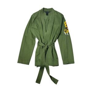 A sturdy olive green cotton jacket with a kimono style design, removable strap, and graphics throughout.
