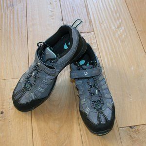 Gray color with teal blue accents. Indoor/Outdoor Cycling / Multisport bike shoe, various outdoor activities.