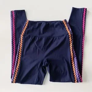 Step up your style with these navy leggings featuring vibrant zigzag patterns. Perfect for any activewear collection.