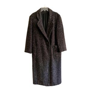 ST. GERMAIN DES PRES, VINTAGE, LONG, SINGLE BREASTED, TWEED COAT. DARK GREY WITH FLECKS OF COLOR. BACK VENT. 2 FRONT POCKETS. MADE IN CANADA. SIZE L