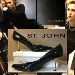 ST JOHN Black Soft Patent with Matte Gold Heel Pumps