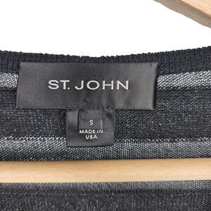 ST. JOHN Black Striped Cardigan Sweater. Small. Semi Sheer. V-Neck. Button Closure. Lightweight. Material unknown. Chest approximately 19 inches pit to pit. Length approximately 26 inches.