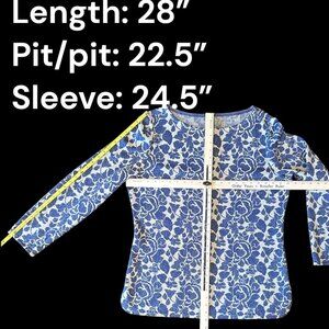 ST. JOHN Blue Floral Knit Metallic Shimmer Top With Long Sleeves Size 14