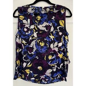 ST. JOHN Blue Floral Silk Blend Ruffle Front Sleeveless Top Blouse Sz S