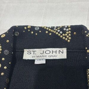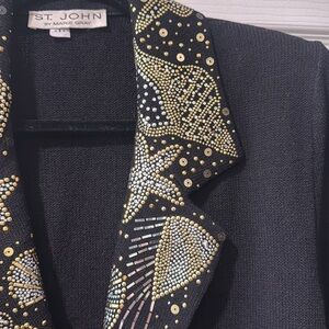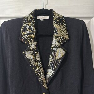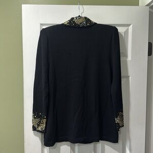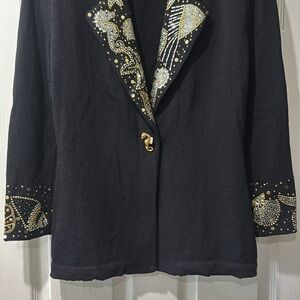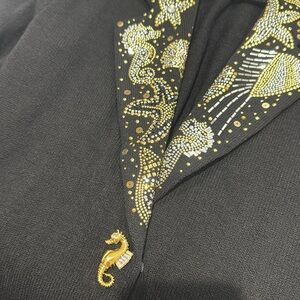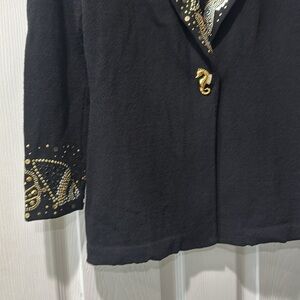 Very nice women’s vintage jacket size 8 in good condition. It had two small holes that were fixed and not very noticeable (see last two pictures). The color is black with silver and gold applications (sea horse and shells).