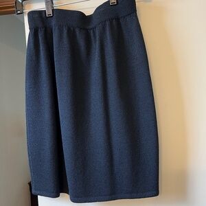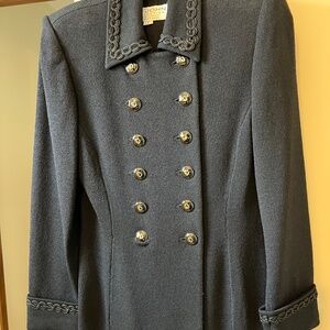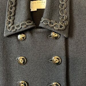 ST JOHN black knitted jacket and skirt suit, with black lace decorative outlines along collar and folded sleeves, jacket center buttons with ST JOHN Logos,