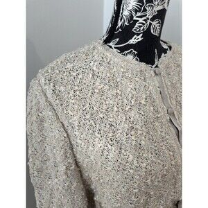 The photos do not do this jacket justice - it is truly stunning! The ivory color and lace pockets give it a classic and elegant touch, while the shimmer and sequin accents add a touch of glamour. Made of a cotton and wool blend boucle knit, this short/cropped jacket features a collarless design and satin buttons for closure.
