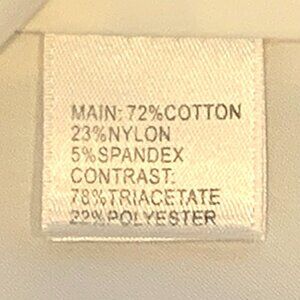 The ST. JOHN Cotton Blend Satin Trim Button Down Top in size 10 is a sophisticated and elegant choice for any party or business occasion. Made from a comfortable cotton-nylon-spandex blend with satin trim accents, this long-sleeve top features a collared neckline and button closure. The multicolor design with off-white and beige/tan trim adds a touch of luxury to the classic and modern style of the top. Easy to care for with a dry clean only requirement, this lightweight and breathable top is perfect for the fall and winter seasons, making it a versatile and stylish addition to any woman's wardrobe.