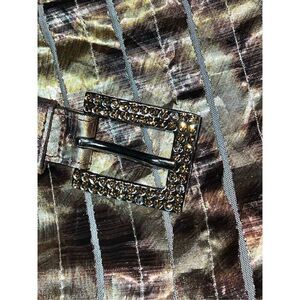 Stunning couture dress! Made of a crinkly, metallic fabric and dress is lined. Features a zipper on the side, detachable belt, puffed sleeve, pleated look on the skirt. Dress is still new with tags however, the belt is missing a few of the rhinestones, but not noticeable when dress is on. Laying flat measures 18" from pit to pit, shoulder to waist is 16" and waist to hem is 23".Be sure to check out my other St. John listings.