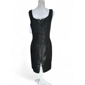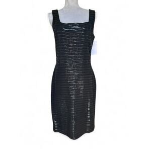Elevate your evening style with this stunning ST. JOHN Evening by Marie Gray dress in size 6. Expertly crafted in the brand’s signature knit, this sheath dress features a sleek black base with shimmering metallic accents, a square neckline, and a flattering tailored silhouette. Perfect for formal occasions, cocktail parties, or special events, this piece embodies timeless luxury and sophistication.