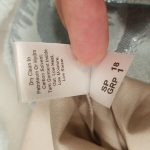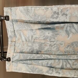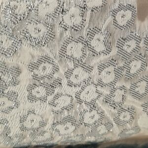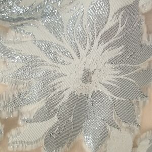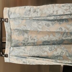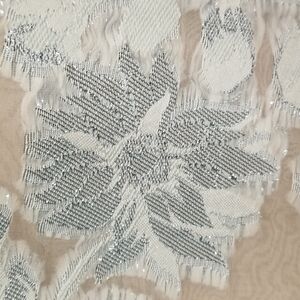Color: Light Beige Silk Lining with Ivory Silk Overlay Decorated with a Metallic Silver Blue Textured Floral Print