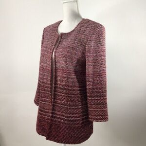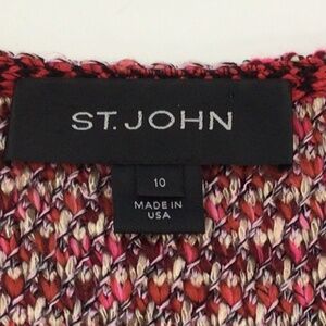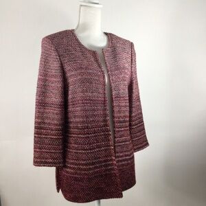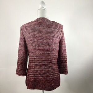 Chic and timeless St. John knit jacket/blazer in a striking red/pink ombre stripe pattern with hints of burgundy and black. Features a slim silhouette, jewel neckline, 3/4 sleeves, and cut-away side vents. Shoulder pads for structure. No buttons for a clean, modern look.