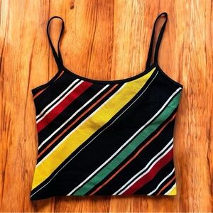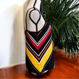 This St. John knit camisole is a bold, statement piece with its diagonal striped design in black, yellow, red, green, and white. Made from a luxurious 80% wool and 20% viscose blend, this top offers both quality and comfort. The sleek spaghetti straps and scoop neckline create a flattering, effortless silhouette.