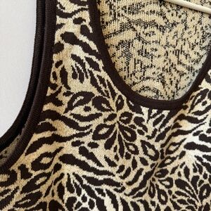Size Large, tan and dark brown animal print with gold metallic threads, sleeveless, round neckline, pull on, layering piece, all season.