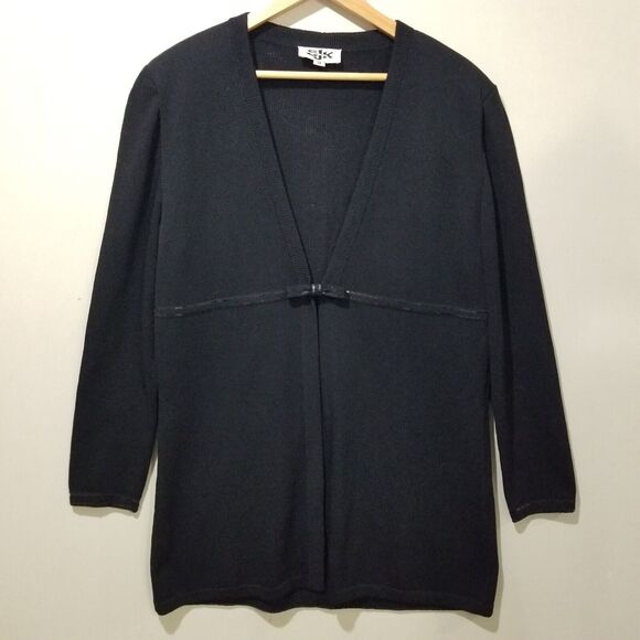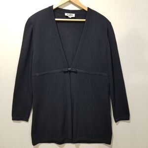 ST. JOHN Santana Knit Sweater Size 14 Black V-Neck Center Bow Clasp Long Sleeve