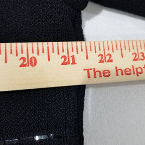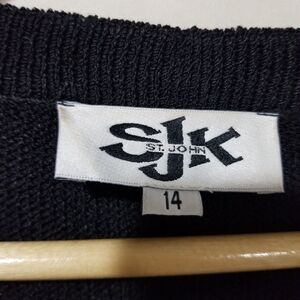This is a ST. JOHN Santana Knit Sweater in size 14, featuring a black color, V-neckline, center bow clasp, and long sleeves. Made of a wool blend and rayon, this sweater is designed in a tight-knit style with wrinkle-free and stretch properties. Ideal for winter and fall, it is suitable for various occasions like travel, weddings, parties, formal events, workwear, and business settings.