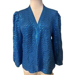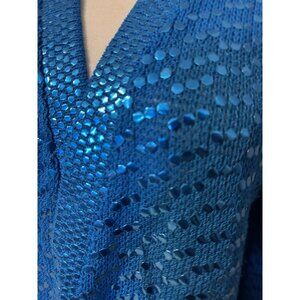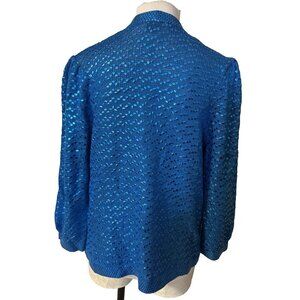 This pretty vintage jacket is from Marie Gray for Saint John in a women's size large. Rich turquoise blue in color with shimmering metallic flecks that imitage sequins. Unlined. Meant to be worn open, it has no fasteners. Shoulders are puffed at the top.