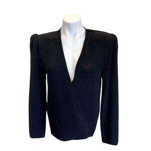 ST. JOHN Vintage 70’s Santana Knit Open Front Puff Shoulders Black Cardigan