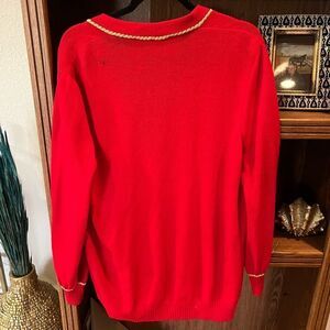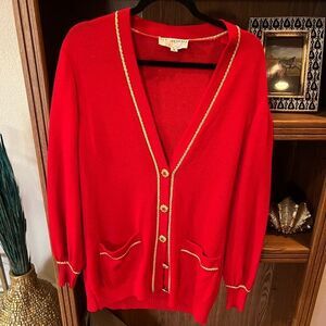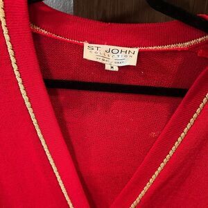 St. John collection red gold wool mock neck sweater cardigan. Super tiny discolors spot on back but not very noticeable otherwise excellent condition.